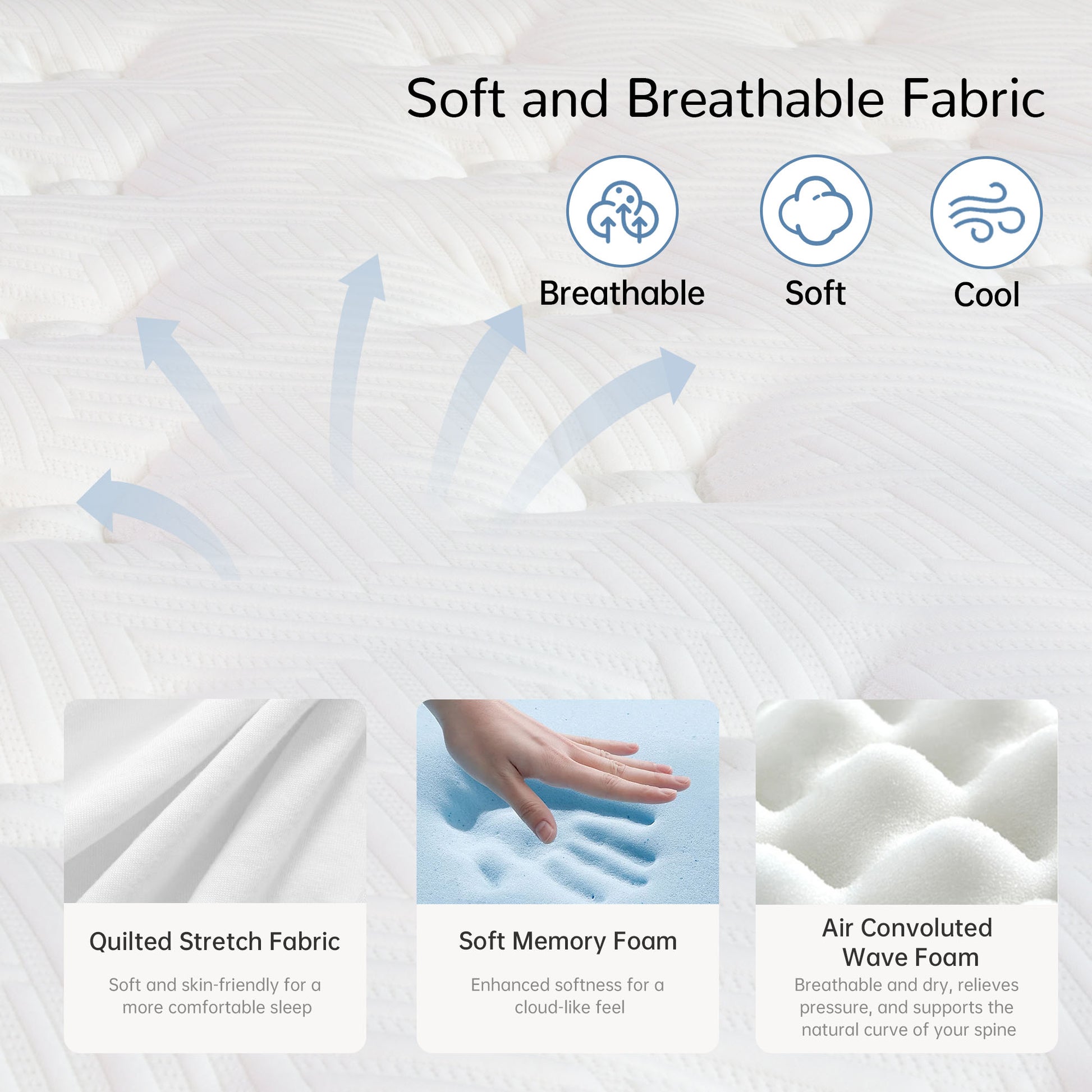 Fiberglass-Free Hybrid Mattress: Safe, Adaptable Comfort. Our hybrid mattress is expertly crafted with gel-infused memory foam, offering exceptional pressure relief and advanced ergonomic support that effortlessly. Adapts to any sleep style. Entirely free of fiberglass, it ensures a hypoallergenic, toxin-free sleep environment, promoting cleaner, healthier rest for the ultimate peace of mind.